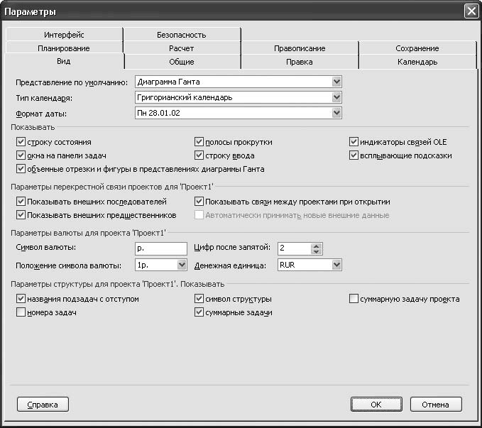 На вкладке Вид выполняют настройку представления данных в окне программы. В частности, вы можете задать вариант отображения, который будет использоваться по умолчанию, для этого выберите подходящее значение в поле Представление по умолчанию. В программе по умолчанию используется представление Диаграмма Ганта (см. рис. 8.1).
