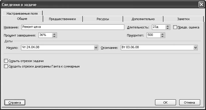 Данное окно состоит из нескольких вкладок: Общие, Предшественники, Ресурсы, Дополнительно, Заметки и Настраиваемые поля, на которых собраны параметры задачи в зависимости от их назначения, смысла и направленности. Кратко рассмотрим содержимое некоторых из них.