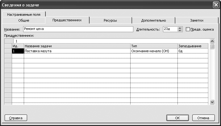 На вкладке Предшественники (рис. 8.4) вы можете сформировать список задач, которые должны предшествовать данной задаче. Например, задаче Монтаж оборудования может предшествовать задача Ремонт цеха и т. д.