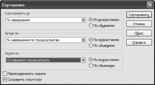 Чтобы отсортировать содержимое списка задач, используйте команды подменю Проект– > Сортировка. Данное подменю включает в себя шесть команд: первые пять предназначены для сортировки задач соответственно по дате начала, по дате окончания, по приоритетам, по затратам и по идентификатору. Шестая команда называется Сортировать по и предназначена для перехода в режим тонкой настройки сортировки одновременно по нескольким критериям. Эту возможность особенно удобно использовать при работе с большими списками задач, а также в иных случаях.