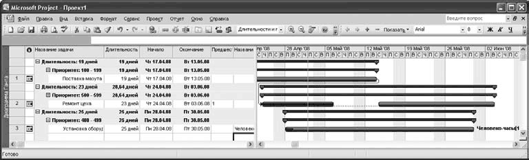 При работе с большим списком задач целесообразно группировать их по разным признакам в однотипные группы – это позволит в случае необходимости быстро найти требуемую задачу. Для группировки задач используйте команды подменю Проект– > Группировка. Например, на рис. 8.8 показана группировка задач по длительностям и приоритетам, созданная в результате выполнения команды меню Проект– > Группировка– > Длительности и приоритеты.