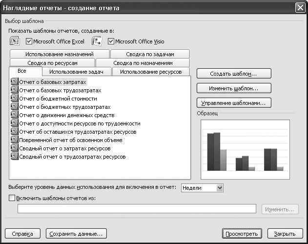Вы можете формировать отчеты как в формате Excel, так и в формате Microsoft Office Visio. Отображением соответствующих шаблонов управляют с помощью флажков Microsoft Office Excel и Microsoft Office Visio, расположенных в верхней части окна.