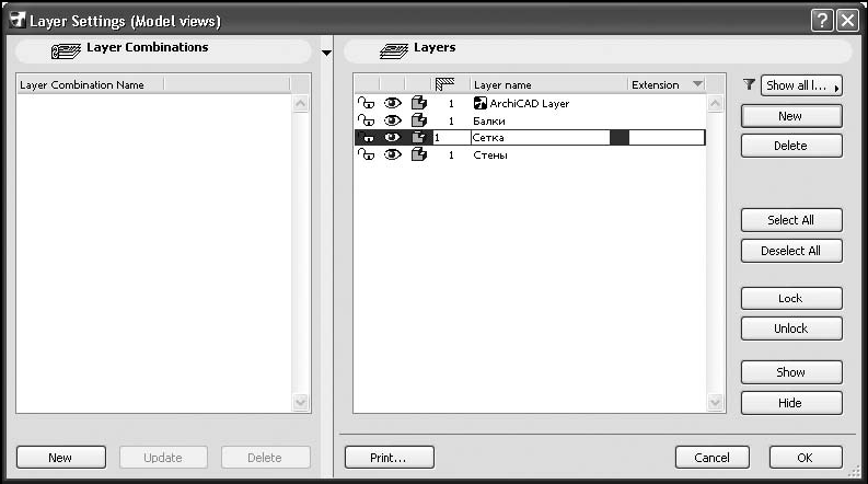 4. Создайте комбинацию слоев Сетка, отключив видимость слоев Балки и Стены, разблокировав слой Сетка и включив его видимость. Слои и комбинации слоев настроены (рис. 7.4).