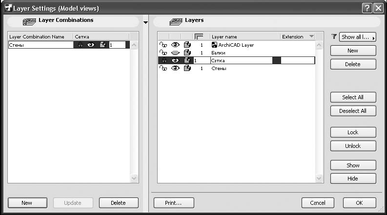 3. Создайте комбинацию слоев Просмотр, включив видимость слоев Стены и Балки, заблокировав их и отключив видимость слоя Сетка.