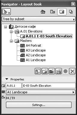Концепция подготовки документации в ArchiCAD базируется на понятии Layout Book (Книга чертежей). Под этим термином понимается совокупность листов чертежа (Layout), на которых пользователь может размещать виды проекта. Лист чертежа связан с шаблоном (Master) – объектом, определяющим параметры листа. Шаблон может включать графические и текстовые объекты, которые будут отображаться на всех листах, связанных с этим шаблоном. Листы чертежей можно группировать в подмножества (Subset), аналогичные папкам, то есть создавать собственную структуру проектной документации.