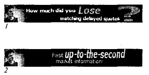 Собственная гордость. Как я уже упоминал, важнейшим мерилом эффективности баннера повсеместно считается величина CTR. Однако представления о приоритетах в создании рекламы и о роли ее в деятельности фирмы сильно отличаются на Западе и в России. Если западные фирмы — как те, что у всех на слуху, так и мало кому известные — на одном уровне важности с CTR ставят имиджевый компонент, опечатывание (то, что по–английски называется «branding») дизайн–образа и названия фирмы в сознание даже тех, кто не собирается щелкать мышью на баннере, то в русскоязычной рекламе пока что преобладает чисто спортивный интерес повышения проклика любыми средствами.