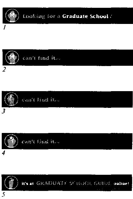 рис. 70 Еще один баннер, пользующийся вопросом для привлечения внимания в самом начале сюжета. Особенность этого экземпляра — в том, что главная тема сообщения («graduate schools») заявлена в первом же кадре, а необычно бедный информацией этап экспозиции (кадры 2–4) намеренно задерживает действие своей монотонной анимацией (поворачивающийся из стороны в сторону «аспирант» с биноклем) нагнетает напряжение перед финальной развязкой (кадр 5)