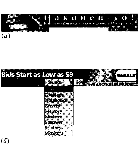 Рис. 71 Баннер (и) довольно типичен для русского Интернета: он комбинирует два самых распространенных «муляжи» элементов интерфейсы — поле вводи с кнопкой поиска и полосу прокрутки вдоль правого края. Баннер (б), наоборот, без обмина и подвоха предлагает вам раскрыть самый настоящий выпадающий список, элементы которого разъясняют и конкретизируют основное содержание баннера