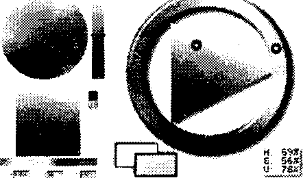 Такое решение более лаконично и функционально, чем предыдущее, — в нем отсутствует бесполезная нижняя сторона квадрата «насыщенность–яркость», перемещение вдоль которой не изменяет цвет вообще. Главное же преимущество такой палитры в том, что цветовой круг, по сравнению с линейной радугой, правильнее отражает наше представление о континууме тонов как о чем–то замкнутом, не имеющем определенного начала и конца, а фиксированное расположение цветов «по сторонам света» к тому же тренирует цветовую память и ассоциативное мышление.