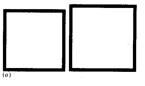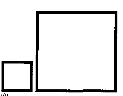 Если размеры двух квадратов отличаются незначительно (рис. 41, а), какого–либо осмысленного отношения между фигурами не возникает — расхождение производит скоре впечатление ошибки или неаккуратности. Конечно, контекст реальной композиции может до известной степей сгладить это ощущение, поддержав каждый из размеров другими размерами или расстояниями. Однако в большинстве случаев столь близких размеров нужно избегать, особенно для элементов близко расположенных или связанных другими аспектами сходства.
