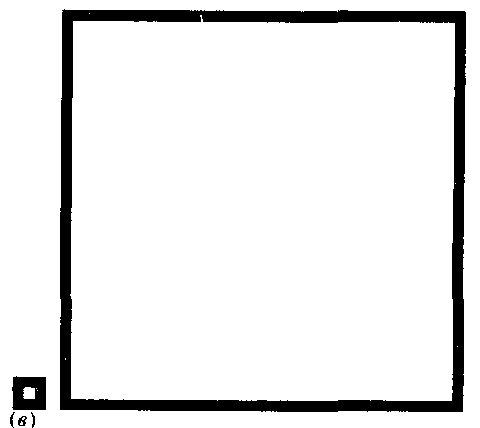 Сделав большой квадрат больше, а маленький меньше (рис. 41, б), мы без труда избавимся от неприятного «дребезжания» слишком близких размеров и получим чистый контраст, максимально выраженный и даже, пожалуй, несколько нарочитый. Наконец, еще больше увеличив разницу в размерах, мы увидим, как контраст снова ослабляется (рис. 41, в) — фигуры начинают терять связь между собой, и мы получаем не два контрастирующих квадрата, а, скорее, точку рядом с безразмерной плоскостью (или, во всяком случае, фигурой настолько большой, что ее форма не распознается с первого взгляда).