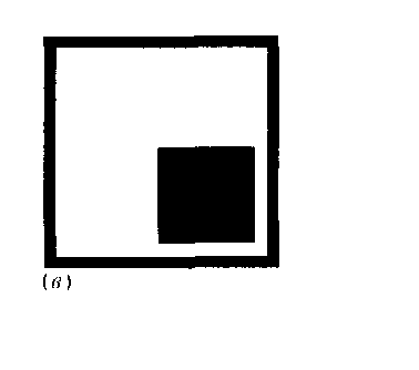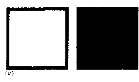 Для этого примера возьмем пару квадратов, окрашенных в максимально контрастирующие цвета — черный и белый (рис. 42, а). Как мы уже знаем (стр. 105), цвет сам по себе — величина многомерная, разложимая на компоненты тона, яркости и насыщенности, причем каждый из этих компонентов по–особому ведет себя при подборе и контрастировании цветов. Чтобы не усложнять пример, я принял за отправную точку контраст только по одному аспекту цвета — по яркости (насыщенность у черного и белого равна нулю, а компонент тона в этих цветах отсутствует).