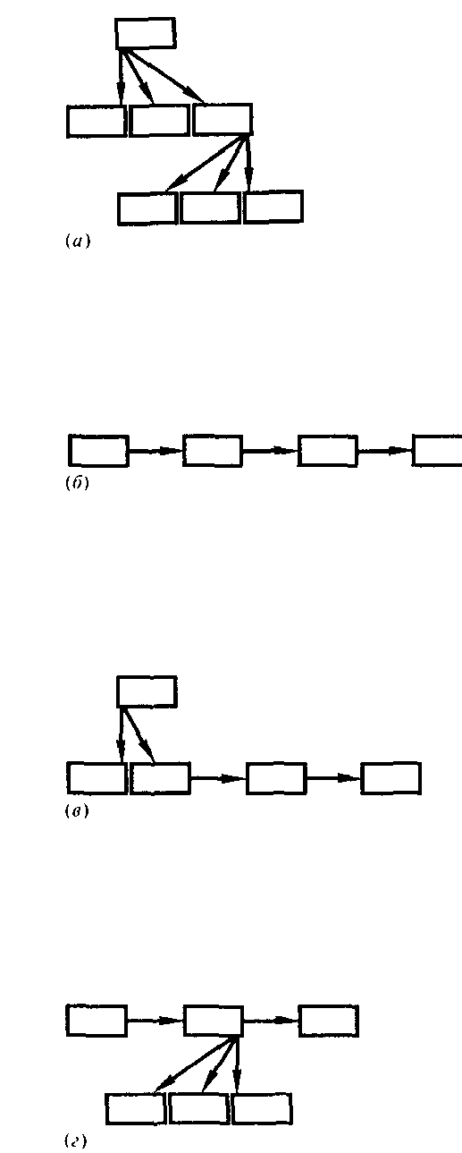 рис. 47 Древовидная (а), линейная (б) структуры сайта и их возможные гибриды (в, г). Вариант (б), впрочем, тоже может снизиться частным случаем дерева с одной веткой при условии, что каждая следующая страница — не логическое развитие темы предыдущей, а необязательное ответвление, подраздел, комментарий и что последняя страница является скорее тупиком, чем концом пути