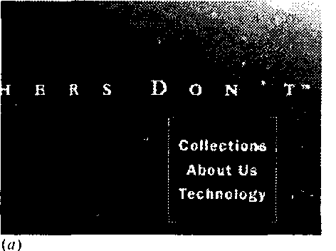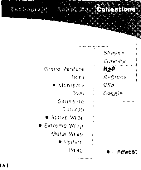 И наоборот, если страница и без того насыщена фотографическими текстурами и криволинейными формами, имей смысл вспомнить о популярной в современном дизайне теш прямых линий (стр. 93), часто применяемой для объединения кнопок панели навигации в единое целое. На рис. Я показаны фрагменты трех последовательных страниц, начиная с заглавной, сайта www.revo.com. Мотив прями линий с засечками на концах, ограничивающих навигационную панель и выделяющих ее на фоне доминирующих м странице плавных дуг и градиентов, вводится уже на первой странице (а). Сайт этот содержит двухуровневую иерархи» страниц, и на подчиненных страницах дизайнер из тех ж прямых линий строит элегантную и интуитивно прозрачную двухэтажную навигационную панель (б, в).