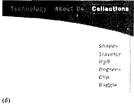 По ту сторону кнопок. Принцип контраста подсказывает плодотворный прием декорирования навигационных панелей: если прикладная функция этого элемента требует разграничения и геометрической упорядоченности кнопок, то с эстетической точки зрения выгодно противопоставив ему нечто объединяющее кнопки в единое целое, нечто подчеркнуто антигеометрическое и нерегулярное. Лучше всего на эту роль подходит общая для всей панели фоновая фотография (пример 16) или абстрактная размыто–фотографическая текстура, «перетекающая» с кнопки на кнопку.