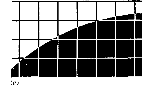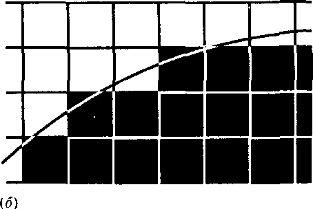 Рис. 55 Кик воспроизвести цветовую границу сложной формы в пиксельной решетке растрового изображения (а)? Без сглаживания каждый граничный пиксел закрашивается одним или другим цветом в зависимости от того, по какую сторону границы лежит большая чисть его площади (б). Анти–алиасинг вводит для граничных пикселов промежуточные тона, в которых пропорция смешения определяется соотношением площадей цветов, приходящихся на соответствующий пиксел (в)