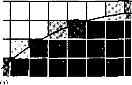 На экране же все обстоит ровно наоборот: пикселы настолько крупны, что заметны невооруженным глазом, но при этом гораздо лучше приспособлены к воспроизведению полутонов. В этой ситуации разумнее закрашивать каждый граничный пиксел промежуточным цветом так, чтобы соотношение смешиваемых цветов соответствовало пропорции, в которой данный пиксел делится границей этих цветов. Например, чем больше приходится черного на пиксел на границе черной и белой областей, тем темнее должен быть его цвет (рис. 55).