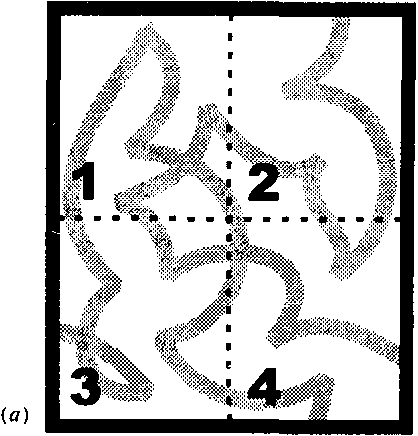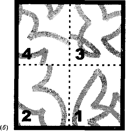 рис. 58 Создание бесшовного фона перестановкой четвертей. Обратите внимание, как заметны стали в (б) нестыковки деталей фона между четвертями 4 и 2, 4 и 3