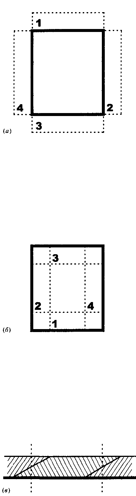 Чтобы сделать аккуратный шов, этому методу нужен «запас материала» по краям прямоугольной «заплаты». Представьте, что вдоль внешних сторон выделения, которое надлежит превратить в бесшовный фоновый изразец, вырезаны четыре полоски определенной ширины (рис. 59, а). Затем каждая из этих полосок перенесена к внутреннему краю противоположной стороны и там наложена поверх старого изображения (рис. 59, б).