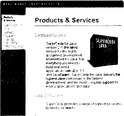 Характерен с этой точки зрения пример 11. Здесь фоновое изображение «дымка от чашки с кофе» (кстати, клишированный образ для всего, что связано с языком Java) прежде всего визуализирует динамику восприятия информации, по сути, делая видимыми «силовые линии» (стр. 167), ведущие от заголовка к визуалу (изображение упаковки программы, которой посвящена страница) и от него снова к тексту. Что особенно важно, фон этот сшивает в единое целое все актуальное содержимое страницы (т. е. все, за исключением навигационной панели и других элементов, повторяющихся на каждой странице сайта). Заметьте, что такой же по форме (хотя иной по текстуре) «дымок» украшает и саму упаковку с программой.