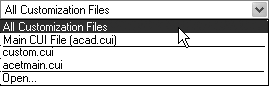 • Customizations in All CUI Files (Адаптация во все файлы НПИ) – здесь представлены элементы настраиваемого пользовательского интерфейса, в которые можно вносить изменения; вы можете изменять все файлы интерфейса или выбрать какой-либо один из раскрывающегося списка, расположенного в верхней части области (рис. 1.21).