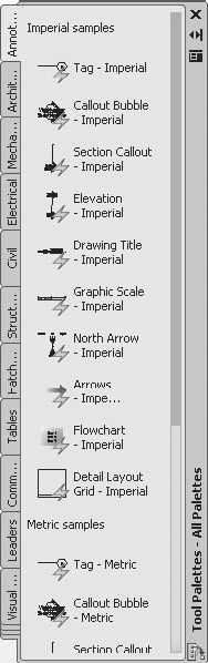 На палитрах удобно размещать часто используемые блоки и штриховки. Для того чтобы вставить блок или штриховку из палитры в рисунок, необходимо «захватить» элемент палитры с помощью мыши и перетащить его в графическую область.