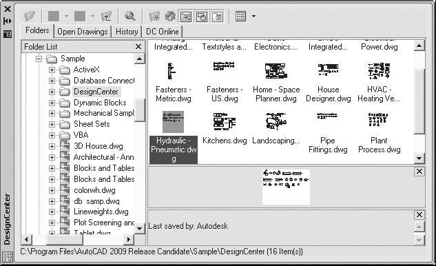 Центр управления DesignCenter предназначен для организации доступа к чертежам и их элементам и обеспечивает: просмотр содержимого чертежей на локальном диске, сетевом диске и веб-страницах; просмотр и вставку в текущий чертеж блоков, слоев, текстовых и размерных стилей, типов линий, внешних ссылок, образцов штриховки и прочих элементов чертежей; доступ к растровым изображениям и сторонним объектам, созданным в других приложениях; обновление описания блоков; перетаскивание элементов чертежа на инструментальные палитры.