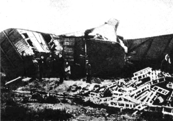 Такая участь постигла десятки вражеских эшелонов. На снимке: эшелон, взорванный диверсионной группой К. М. Мячикова.