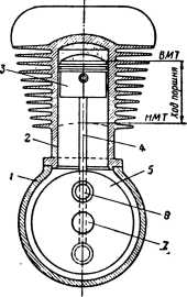 Коленчатый вал преобразует возвратно-поступательное движение поршня во вращательное. Он состоит из шатунного пальца, на который опирается через подшипник кривошипная головка шатуна, щек, образованных в данном случае маховиками, и коренных пальцев, закрепленных в центре маховиков. Коренными пальцами коленчатый вал опирается на коренные подшипники, расположенные в стенках картера. Маховики, благодаря накопленной в них энергии, обеспечивают поддержание равномерности хода двигателя и трогание мотоцикла с места. Связанный с поршнем через шатун коленчатый вал двигателя, вращаясь, перемещает поршень в цилиндре, причем поршень то отходит от оси коренных шеек коленчатого вала на максимальное расстояние, то приближается к ней. Крайние положения поршня в цилиндре называются мертвыми точками. При наибольшем удалении от оси коренных шеек коленчатого вала поршень находится в верхней мертвой точке (ВМТ). При наименьшем удалении поршня от оси коренных шеек поршень находится в нижней мертвой точке (НМТ). Объем, освобождаемый поршнем в цилиндре при перемещении от верхней мертвой точки до нижней, называется рабочим объемом цилиндра. Он равен произведению площади поперечного сечения цилиндра на ход поршня, который в свою очередь равен расстоянию, проходимому поршнем при перемещении от одной мертвой точки до другой.