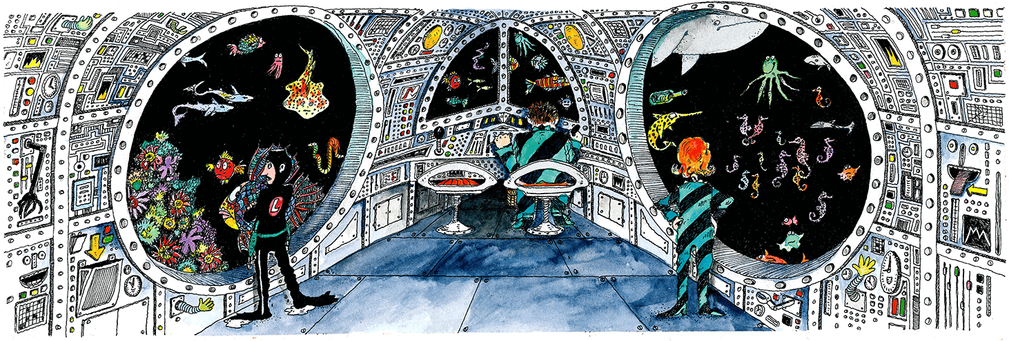 – Далеко ли ещё, Подслушка? – нетерпеливо спрашивал герр Носс. День-деньской он стоял у большого иллюминатора «Морского чёрта» и высматривал водяных. Но ни одного пока не увидел, даже вдалеке.