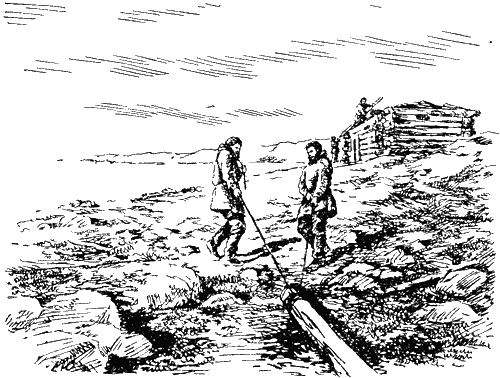 Запасшись провизией, грумаланы с новыми силами взялись за работу. Прежде всего нужно было снабдить Федора лесом для избы. Лес выбирали из плавника и сносили его ближе к жилью.