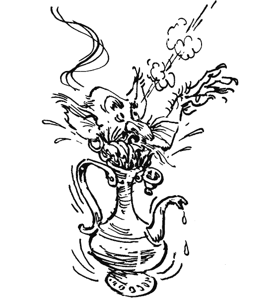 Джинн подпрыгнул, взялся руками за горло кувшина, опустил внутрь ноги и, уменьшаясь, исчез в его горлышке. Когда снаружи осталась только голова и руки, джинн помахал на прощание Алисе и сказал:
