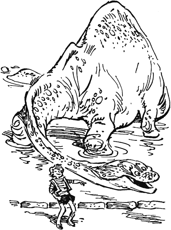 Они вышли к пруду, в котором жил динозавр Бронтя. Бронтя спал. Он весь ушел под воду, и снаружи торчали только его ноздри и глаза, как будто островки посреди пруда.