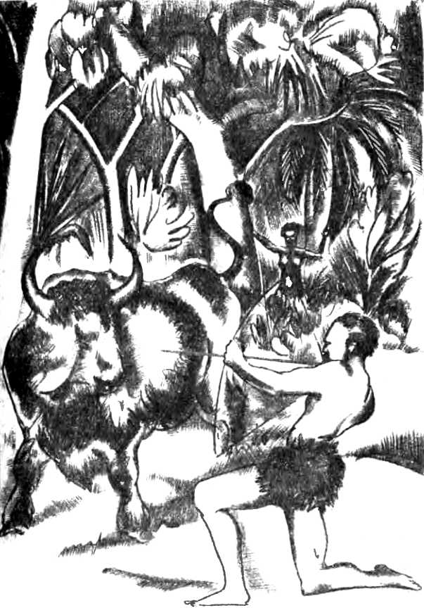 Устроив свои дела с теленком, я направился к Ямбе, которая все время старалась привлекать к себе внимание буйвола. Она махала руками и визжала сидя на дереве, а буйвол, разъяренный всем этим, с громким ревом взрывал ногами землю у основания дерева. Я уже наложил стрелу и готов был спустить ее, как буйвол услыхал мои шаги. Он повернулся и бросился прямо на меня. Минута была ужасная, но я не растерялся. Я знал, что смело могу положиться на свою меткую стрельбу из лука. Я спокойно выжидал, пока буйвол не подбежал ко мне совсем близко, и тогда пустил стрелу.