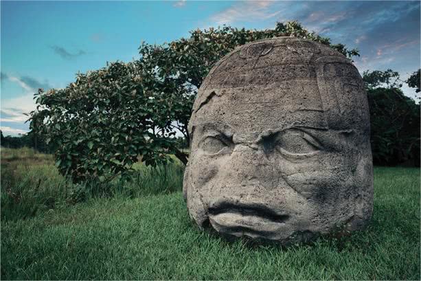 Есть много мест, где можно встретиться с Древним миром лицом к лицу, но мало какие из них впечатляют так, как уголок мексиканских джунглей, где стоит гигантская каменная голова, возраст которой насчитывает 3000 лет. Громадная, высотой больше двух метров (с глазными яблоками почти полметра шириной) и весящая почти 20 тонн, она была создана ольмеками, самой ранней из известных нам цивилизаций Центральной Америки. При ближайшем рассмотрении становятся заметны детали изваяния. Между его губ (а это почти наверняка он) чуть виднеются зубы; на глазах прорисованы радужки; брови слегка нахмурены, а голову покрывает украшенный узорами шлем. Трудно не испытать волнение от созерцания человека из далекого прошлого. Несмотря на огромную временную дистанцию и то, что это всего лишь каменное изваяние, невозможно не почувствовать некое родство с ним как с представителем человеческого рода.