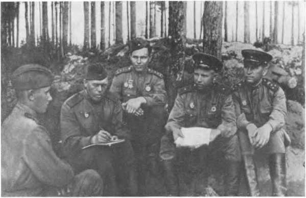 Командир 320-го гмп Н. Д. Силин (в центре) проводит занятия с командирами дивизионов.