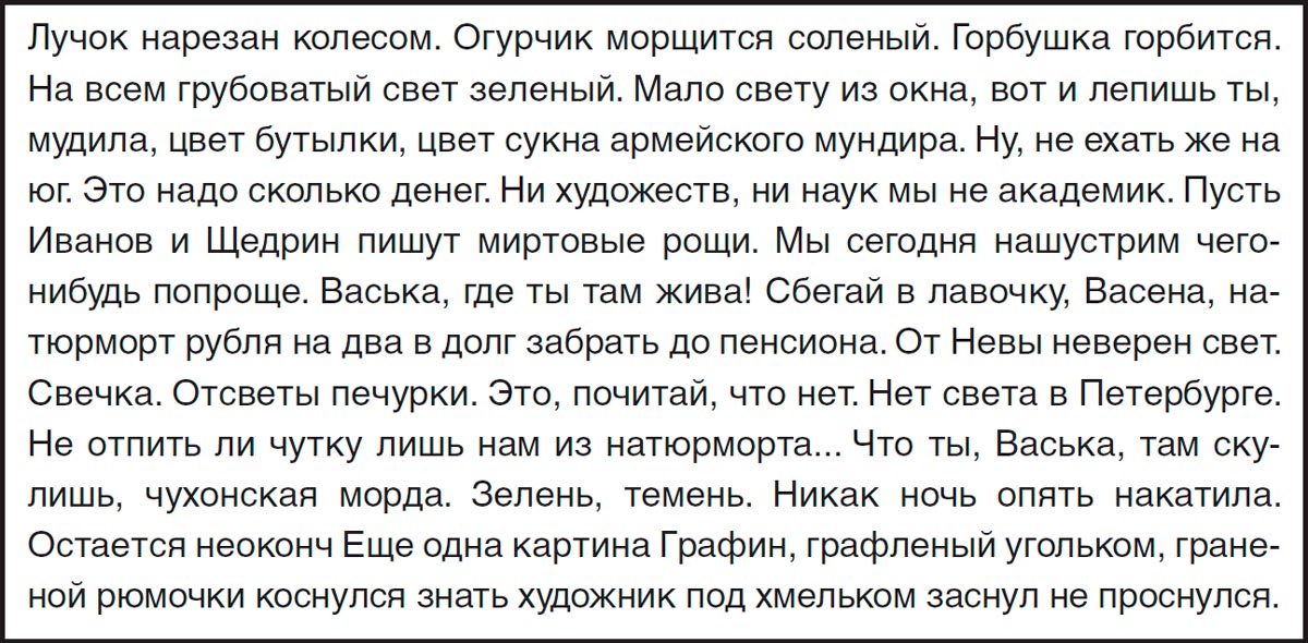 Лучок нарезан колесом. Огурчик морщится соленый. Горбушка горбится. На всем грубоватый свет зеленый. Мало свету из окна, вот и лепишь ты, мудила, цвет бутылки, цвет сукна армейского мундира. Ну, не ехать же на юг. Это надо сколько денег. Ни художеств, ни наук мы не академик. Пусть Иванов и Щедрин пишут миртовые рощи. Мы сегодня нашустрим чего-нибудь попроще. Васька, где ты там жива! Сбегай в лавочку, Васена, натюрморт рубля на два в долг забрать до пенсиона. От Невы неверен свет. Свечка. Отсветы печурки. Это, почитай, что нет. Нет света в Петербурге. Не отпить ли чутку лишь нам из натюрморта… Что ты, Васька, там скулишь, чухонская морда. Зелень, темень. Никак ночь опять накатила. Остается неоконч Еще одна картина Графин, графленый угольком, граненой рюмочки коснулся знать художник под хмельком заснул не проснулся.
