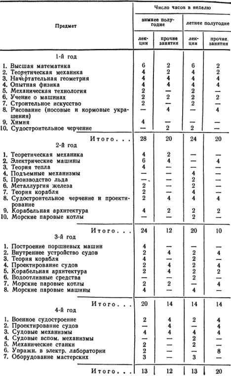 Предметы преподавания на кораблестроительном отделе с уделяемым на изучение их временем распределяются следующим образом: