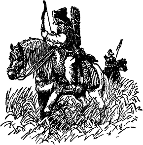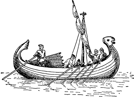 — Большим опасностям подвергаются русские купцы во время своего далекого и трудного пути, — продолжает свой рассказ словоохотливый дед. — Степные хищники притаились в прибрежных зарослях или в густой высокой траве… Они выслеживают русских купцов. Они зорко следят, не покажется ли киевская ладья на гладкой поверхности реки. Заметили… и пустили стрелы… Тучи стрел несутся навстречу кораблю… Если погибнут гребцы, — погибнет и корабль. Необходимо сохранить гребцов — скрыть их от неприятельских стрел.
