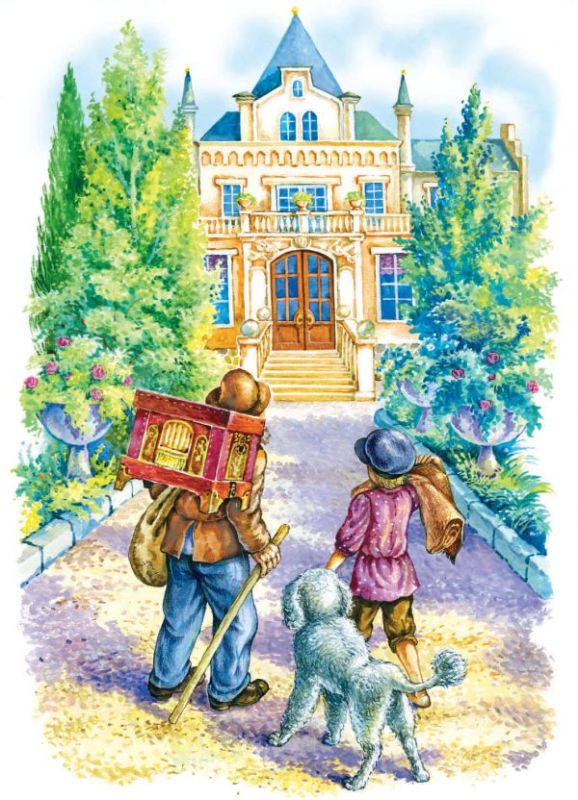 Дорожки сада были усыпаны ровным крупным гравием, хрустевшим под ногами, а с боков обставлены большими розовыми раковинами. На клумбах, над пёстрым ковром из разноцветных трав, возвышались диковинные яркие цветы, от которых сладко благоухал воздух. В водоёмах журчала и плескалась прозрачная вода; из красивых ваз, висевших в воздухе между деревьями, спускались гирляндами вниз вьющиеся растения, а перед домом, на мраморных столбах, стояли два блестящие зеркальные шара, в которых странствующая труппа отразилась вверх ногами, в смешном, изогнутом и растянутом виде. Перед балконом была большая утоптанная площадка. Сергей расстелил на ней свой коврик, а дедушка, установив шарманку на палке, уже приготовился вертеть ручку, как вдруг неожиданное и странное зрелище привлекло их внимание. На террасу из внутренних комнат выскочил как бомба, издавая пронзительные крики, мальчик лет восьми или десяти. Он был в лёгком матросском костюмчике, с обнажёнными руками и голыми коленками. Белокурые волосы, все в крупных локонах, растрепались у него небрежно по плечам. Следом за мальчиком выбежало ещё шесть человек: две женщины в фартуках; старый толстый лакей во фраке, без усов и без бороды, но с длинными седыми бакенбардами; сухопарая, рыжая, красноносая девица в синем клетчатом платье; молодая, болезненного вида, но очень красивая дама в кружевном голубом капоте и, наконец, толстый лысый господин в чесучовой паре и в золотых очках. Все они были сильно встревожены, махали руками, говорили громко и даже толкали друг друга. Сразу можно было догадаться, что причиной их беспокойства является мальчик в матросском костюме, так внезапно вылетевший на террасу.
