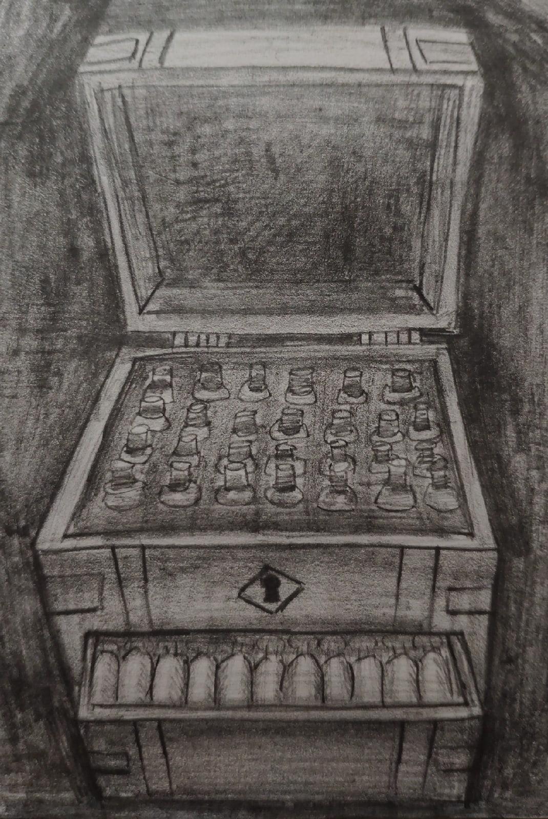 Сундучок был перенесен на стол для общего обозрения, после чего Реймс аккуратно открыл крышку и выдвинул маленький ящик. Десятки маленьких флаконов, закупоренные полупрозрачными пробками, содержали в себе тёмно-фиолетовый порошок и покоились в оббитых тканью выемках. Владелец сундучка явно побеспокоился о его содержимом, так как даже внутренние стенки были покрыты несколькими слоями ворсистого материала, смягчающего последствия тряски. Более внимательный осмотр и манипуляции с ножом позволили обнаружить еще один ряд флаконов, расположившийся в конструкции схожей с лифтом. Пока центральный ящик был задвинут — внутренняя стойка оставалась неподвижной, но стоило только отодвинуть мешавший запор — вся внутренняя секция без проблем извлекалась наружу.