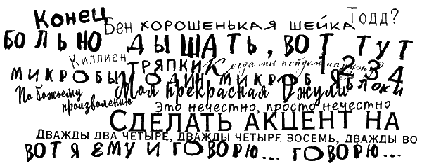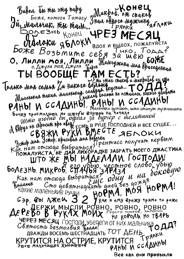 И если бы только плакали и пели. Если бы только словами. Есть еще и картинки. Картинки хлещут тебе в голову потоком, как бы ты ни сопротивлялся: воспоминания, фантазии, тайны, планы, вранье, вранье, вранье. Потомуш и в Шуме можно врать – даже когда все вокруг знают, што ты думаешь, можно закопать одно под другое, спрятать у всех на виду; просто не думать четко или уговорить сам себя, што правда не это, а прямо противоположное, так што кто его разберет в целом потоке, где вода, а чем и носка не замочишь?