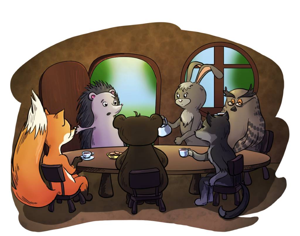 Запыхавшийся от быстрого бега Ёжик ворвался в залитую светом гостиную Зайца, где уже сидели все его друзья: хозяин домика, ушастый Заяц; толстый глупый Мишка, который хорошо разбирался только в мёде; мудрый Филин, часто засыпавший на их посиделках и что-то бормочущий во сне; Лисичка, то и дело поглядывавшая на свой пушистый хвост; и серый Волчонок, желавший во что бы то ни стало стать вожаком стаи, когда вырастет.