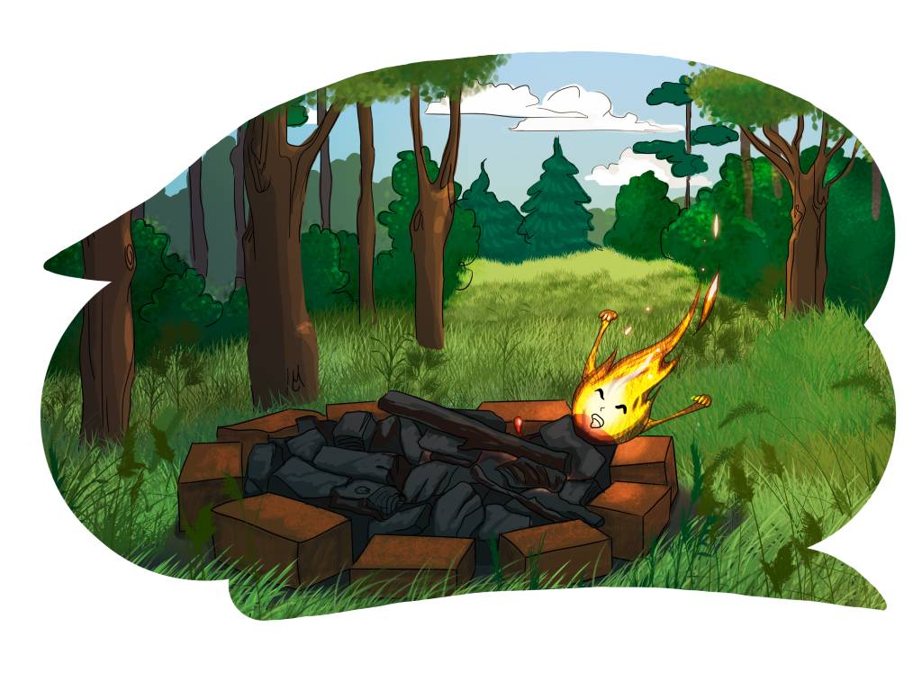 Однажды летом в Лес пришли люди. Они отдыхали, смеялись, пекли картошку, пели песни под гитару. Переночевали в палатках. А утром, позавтракав, собрали все вещи и ушли. Вот только плохо залили костер. Уголёк в глубине костра спал, когда люди ушли, но потом проснулся, разбуженный ласковым ветерком.