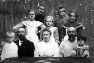 Стоят:Михаил, Вера; сидят:Варя, Варвара Михайловна с Колей, Надежда; в нижнем ряду:Леля и Иван