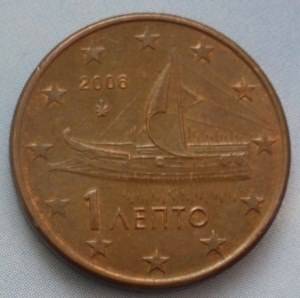 На монете в 1 цент изображена модель триеры времен Кимона, V век до н.э., которая находится в афинском Морском музее.