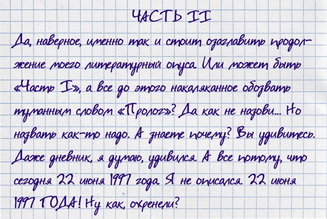 Итак, на дворе 1997 год. И точка. Я не вру. Правда. Которая на страницах этого дневника еще вчера была в июне 1996, а сегодня опять-таки в июне, но уже 1997, то есть ровно год спустя. Прикиньте? Все это время я не писал здесь ничего. Я даже не знал, куда забросил тогда этот дневник. Точнее, наверняка знал, но успел благополучно забыть. И не вспоминал. Просто наткнулся на него сегодня, когда искал сигареты… Да, я курю. Мы курим. Брат не решился отличаться. Мог бы, но не решился. Так что мы снова все делаем вместе и даже это. Курим. Родители, уверен, знают, но помалкивают. Да и как не знать. Когда буквально пару-тройку недель назад, мы стояли под козырьком подъезда и курили, было около семи вечера, надо же быть такими дураками, как будто не знали, что мама с работы в это время как раз приходит. Стоим курим, дождь льет (потому, в общем, под козырьком и стояли, так бы хрен нас запалили), курим. Брату приспичило. Дал мне сигарету подержать, сам куда-то в кусты… В дождь е-мое!