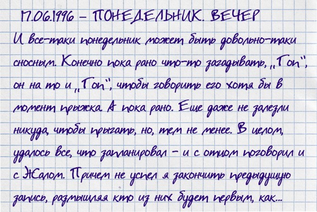 Но сегодня не тот случай. Сегодня именно тот понедельник, который приятен, потому что, во-первых, это последняя неделя с последним экзаменом и долой школу (нужно только как-то пережить выпускной… после такого последнего звонка, какой у нас выдался в наш последний год в школе – обязательно как-нибудь расскажу), а во вторых, то, что я запланировал, может сегодня же и начаться. И пусть это будет только первый шаг, в любом случае дальше будут другие, и все они в итоге к чему-нибудь да приведут. А вот к чему – я планировать не хочу. Все должно быть постепенно. Сначала одно, потом другое. Вот и еще один ответ. Чтобы начать что-то хорошее для себя и не волноваться о том, сколько сил это у тебя отнимет, это что-то должно быть действительно для тебя важным. Кручу-верчу-заворачиваю. Ха-ха, времени нет, а он, то бишь я, разошелся тут.