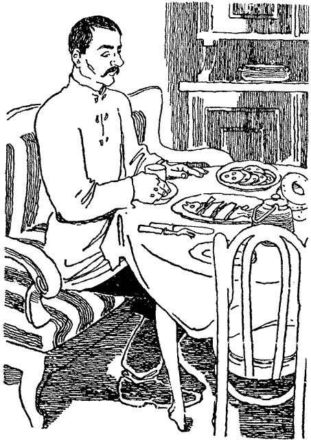 Но дядя Фома робеет перед ней до безъязычия. Чинно и чопорно сидит он сейчас на диване и обжигает себе рот горячим чаем, не смея прикоснуться к колбасе, и молчит целый час, как немой. Мама заговаривает с ним на всевозможные темы, но он только „да“ или „нет“.