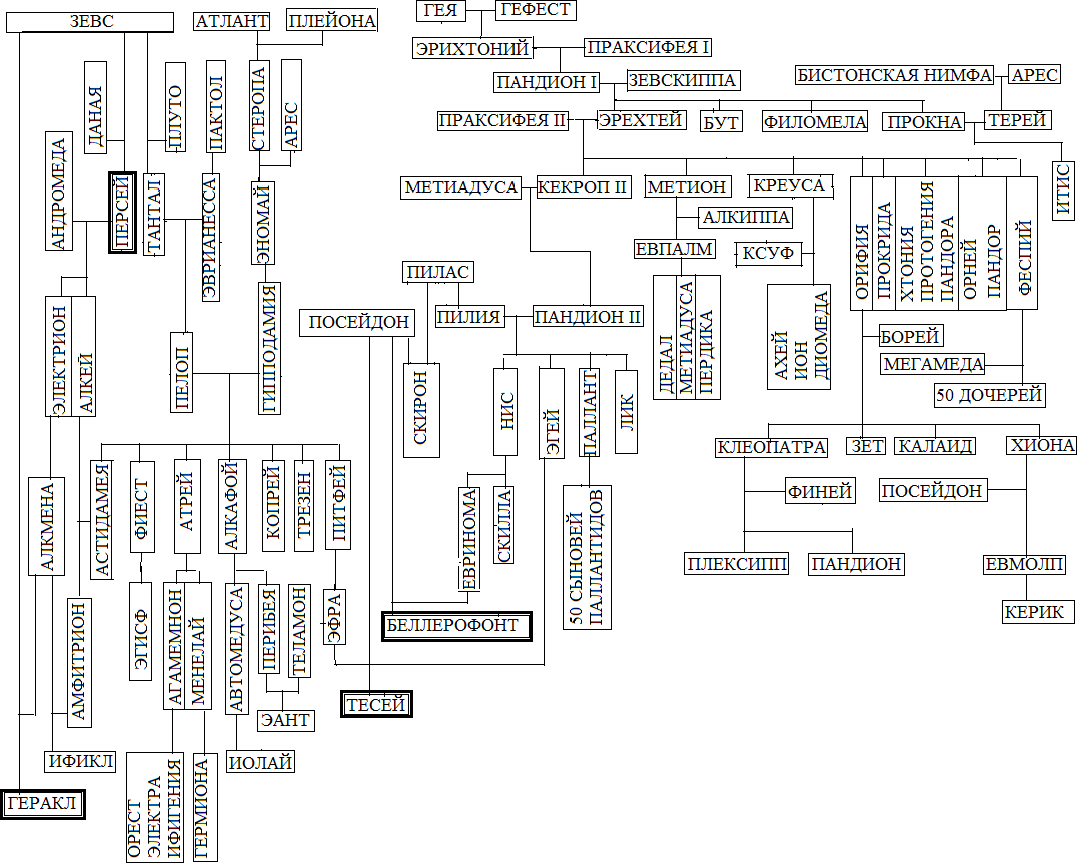На одном листе можно изображать генеалогическое древо одного героя или генеалогические связи между несколькими выбранными героями. Поэтому генеалогические схемы не однозначны, т. е. их можно изображать по-разному. Например, можно изобразить на одном листе происхождение четырех самых знаменитых героев – истребителей чудовищ: Персея, Геракла, Тесея и Беллерофонта, однако при этом чем-то придется пожертвовать. Например, на нижерасположенной схеме за неимением места на листе не удалось изобразить происхождение матери Персея Данаи.